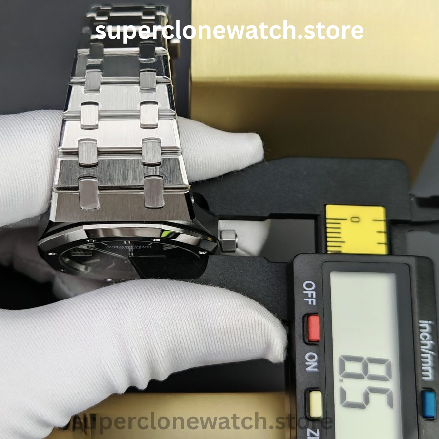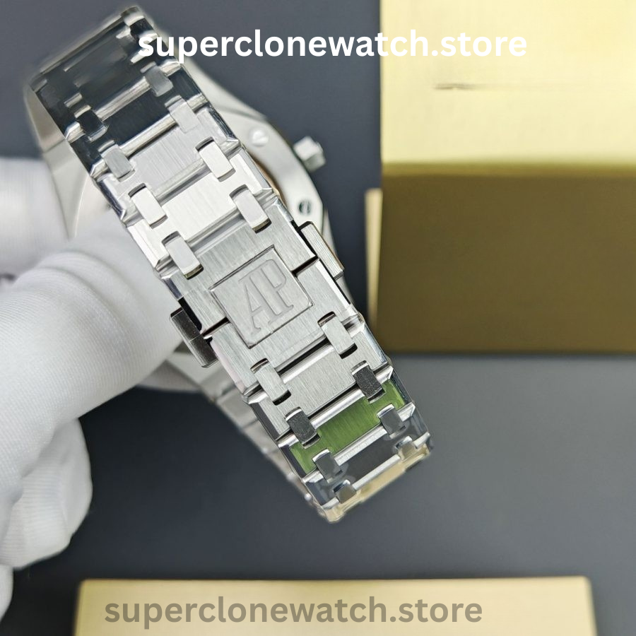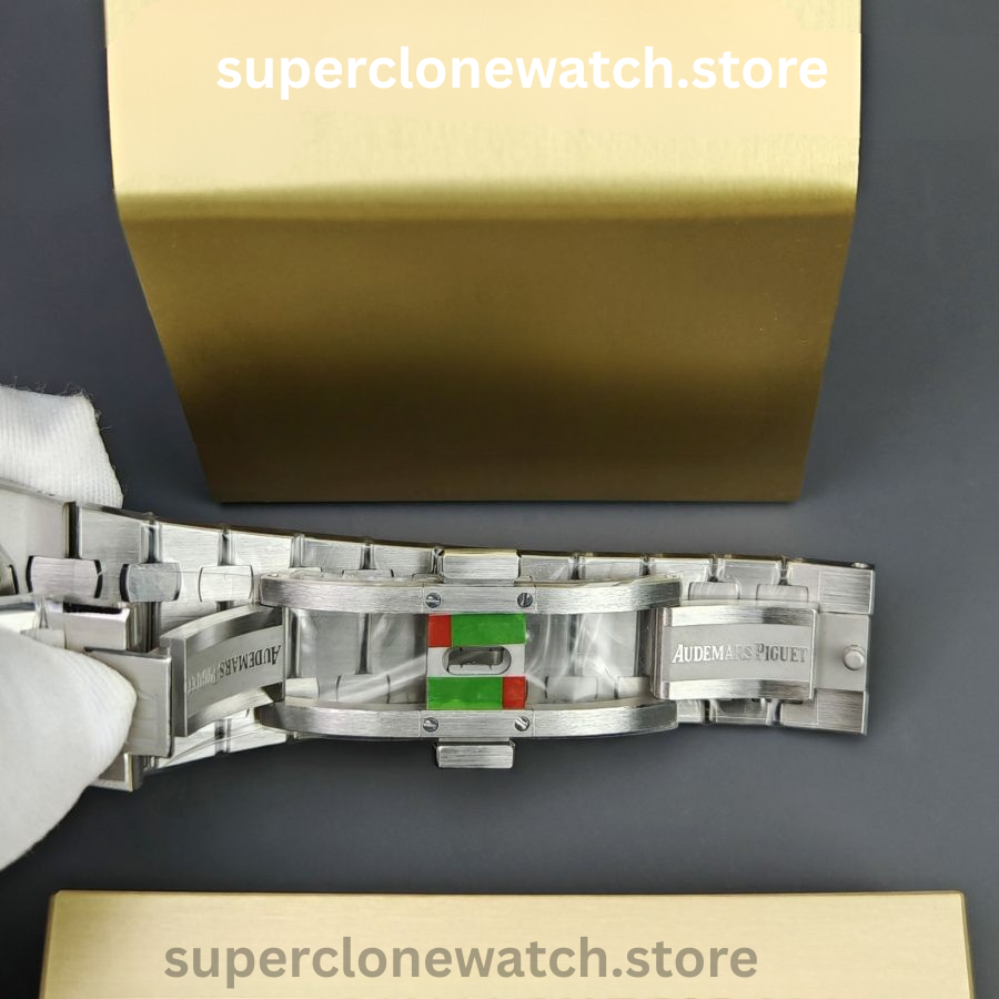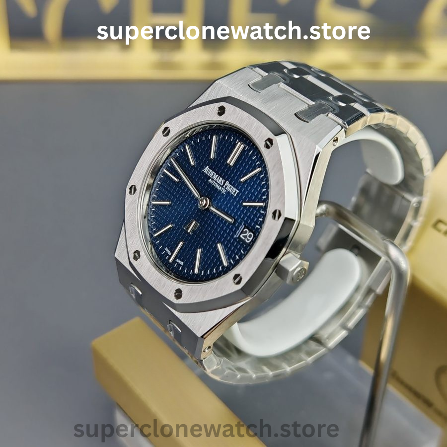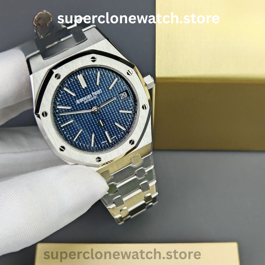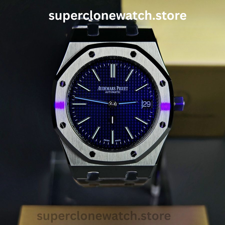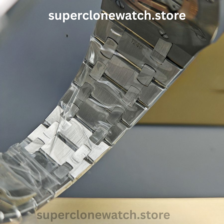 The deep Blue Nuit dial features sharp, well-defined square textures with accurate color tone and printing, ensuring a correct vintage Royal Oak aesthetic. -