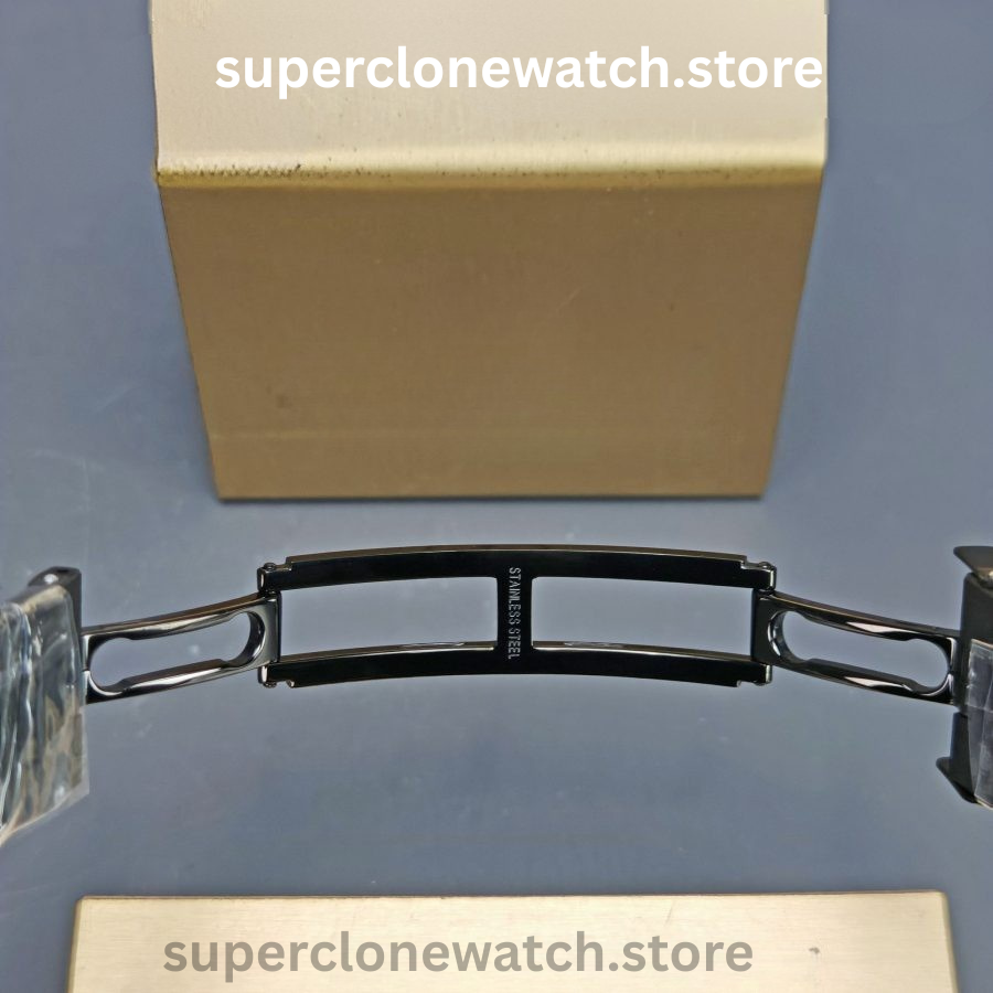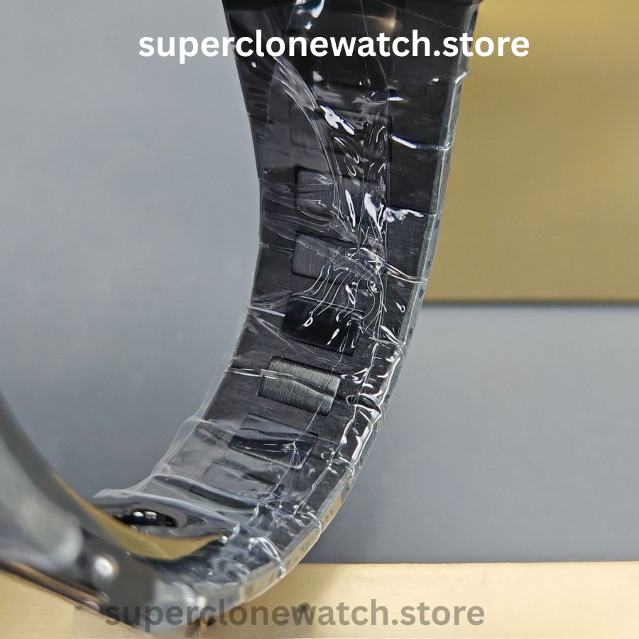 The dial is carefully coordinated with matching hour markers and hands, delivering a refined yet aggressive look with a subtle luxury feel. The caseback is crafted from stainless steel with a black-coated finish, ensuring visual consistency across the entire watch. The strap further elevates the design—crafted from a fusion of carbon fiber and stainless steel—creating a dramatic, cloud-like texture reminiscent of smoke, which makes this piece instantly recognizable.