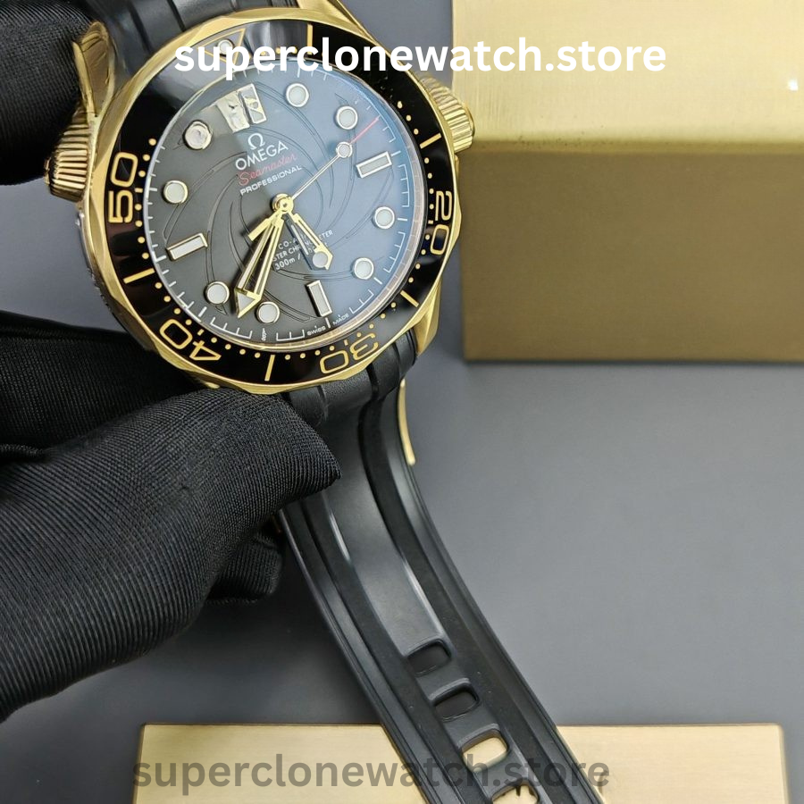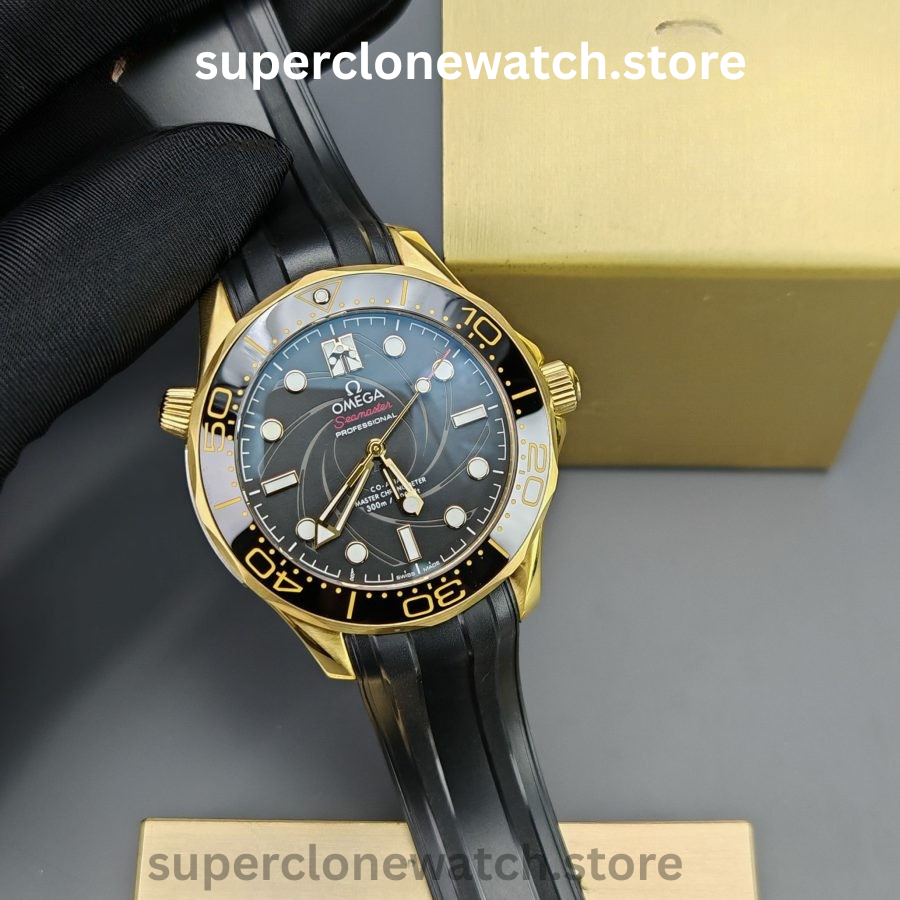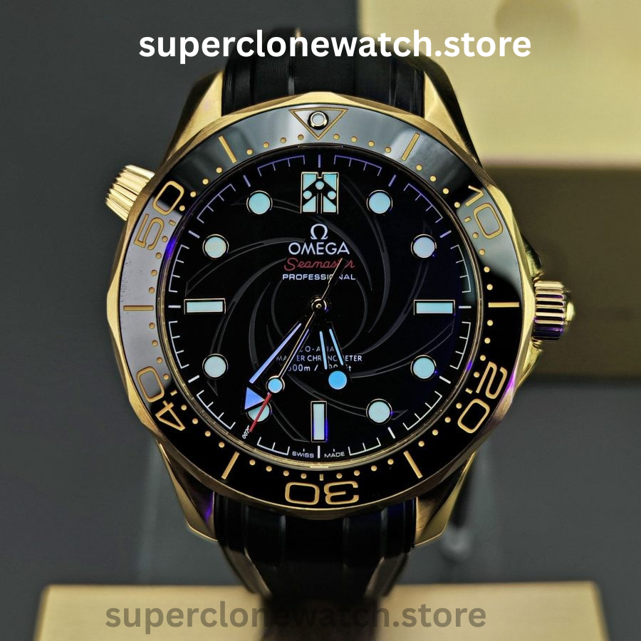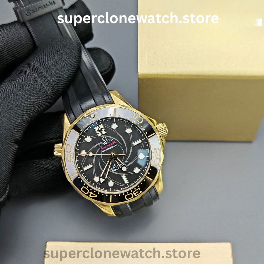This Super Clone Seamaster Diver 300M features a black ceramic bezel accented with a spiral-style ceramic arrow and finished with a black PVD coating. The center design is laser-engraved with the iconic Bond-series rifle pattern, complete with a precise 9 mm central aperture, delivering a bold and distinctive visual identity.