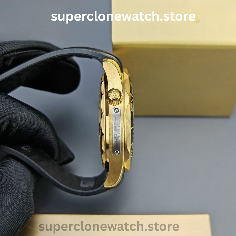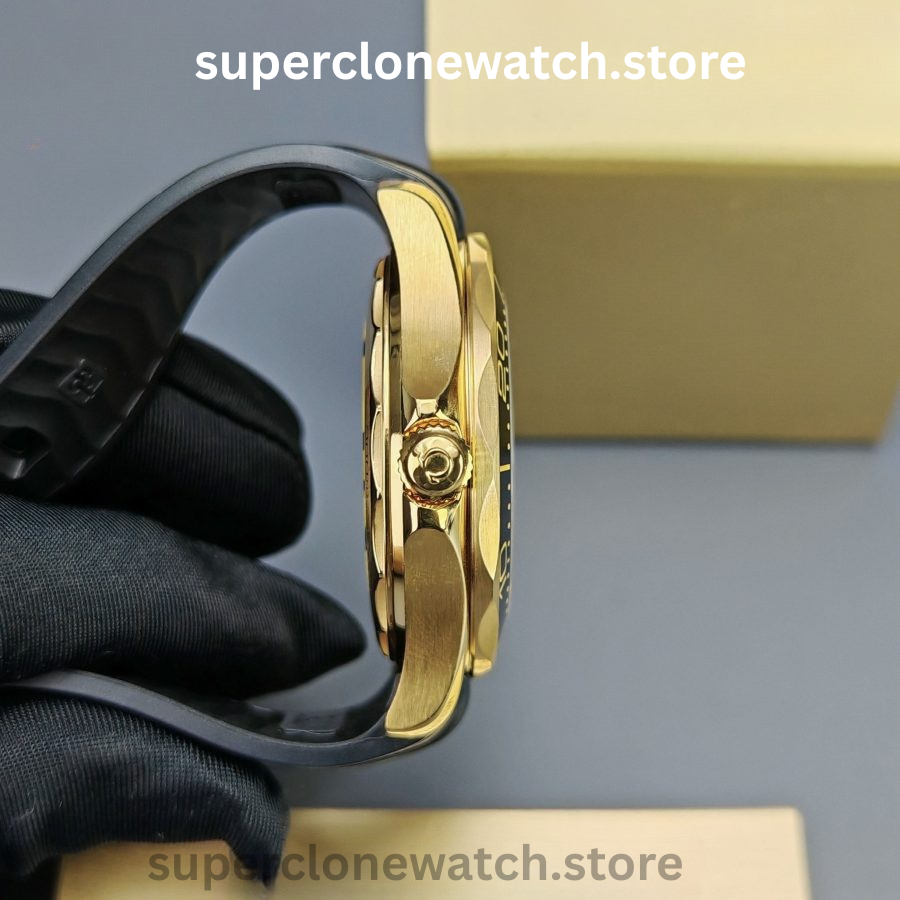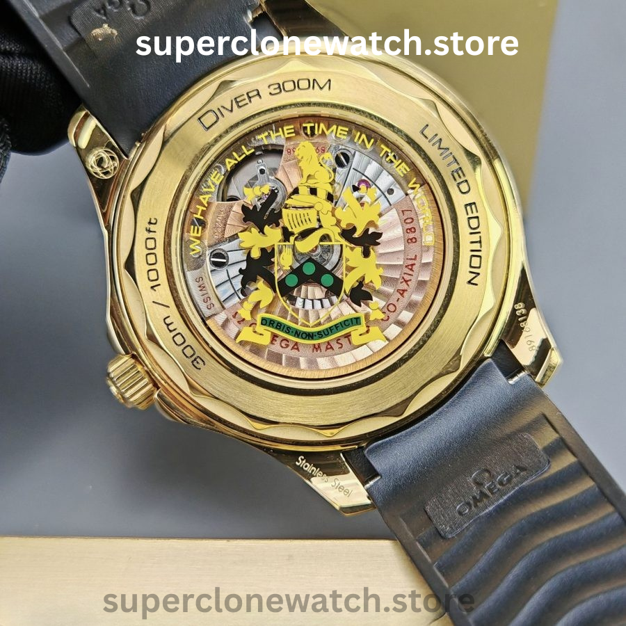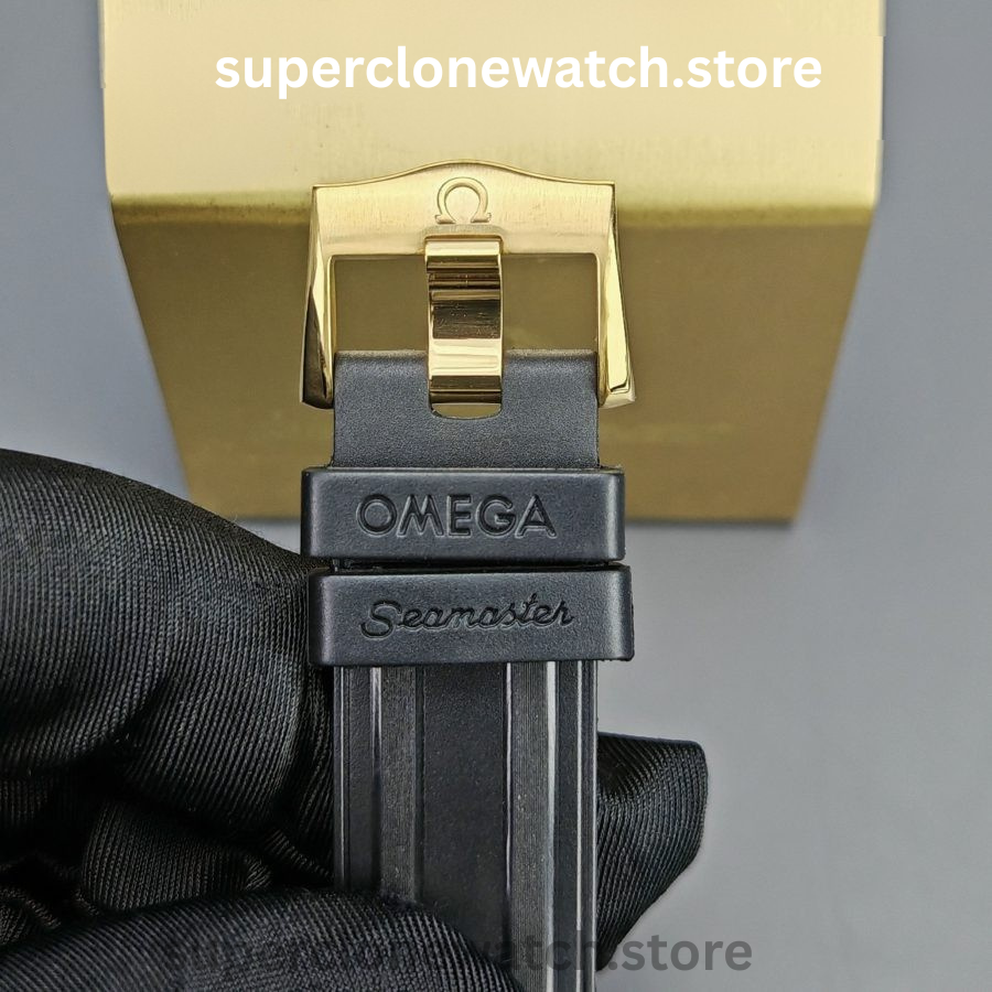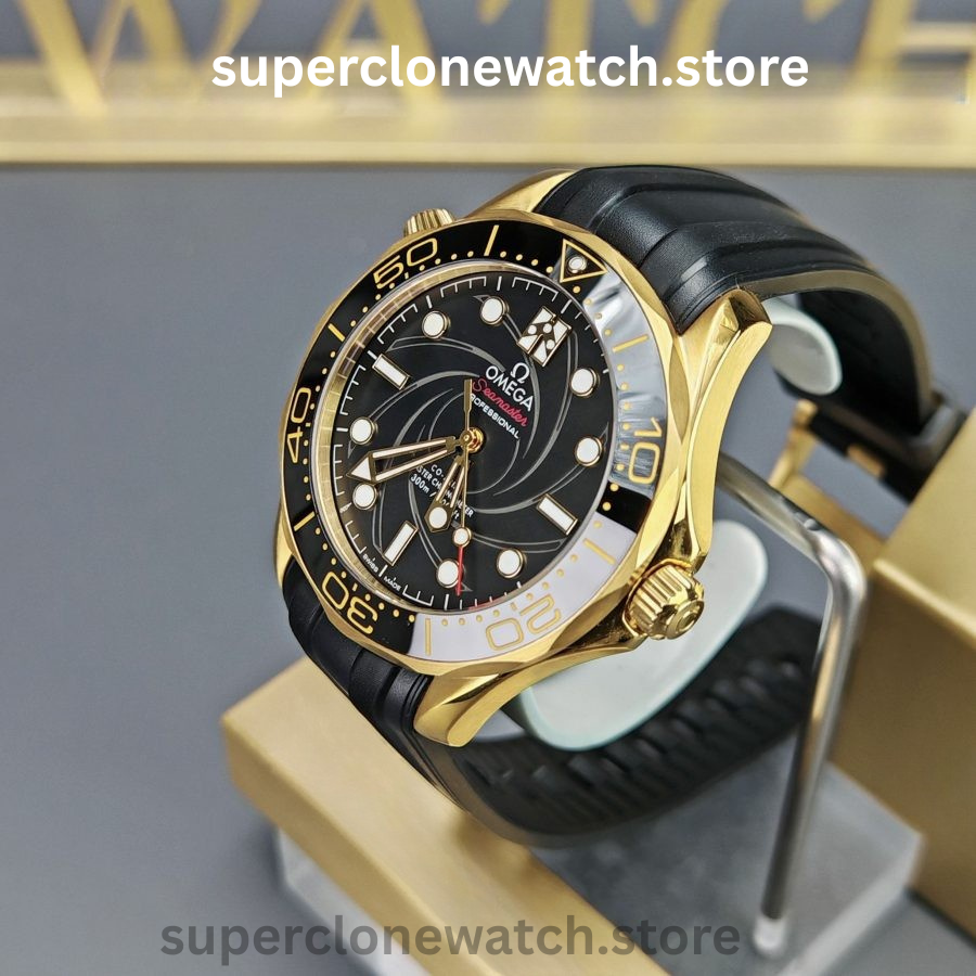 This Super Clone Seamaster Diver 300M features a black ceramic bezel accented with a spiral-style ceramic arrow and finished with a black PVD coating. The center design is laser-engraved with the iconic Bond-series rifle pattern, complete with a precise 9 mm central aperture, delivering a bold and distinctive visual identity.