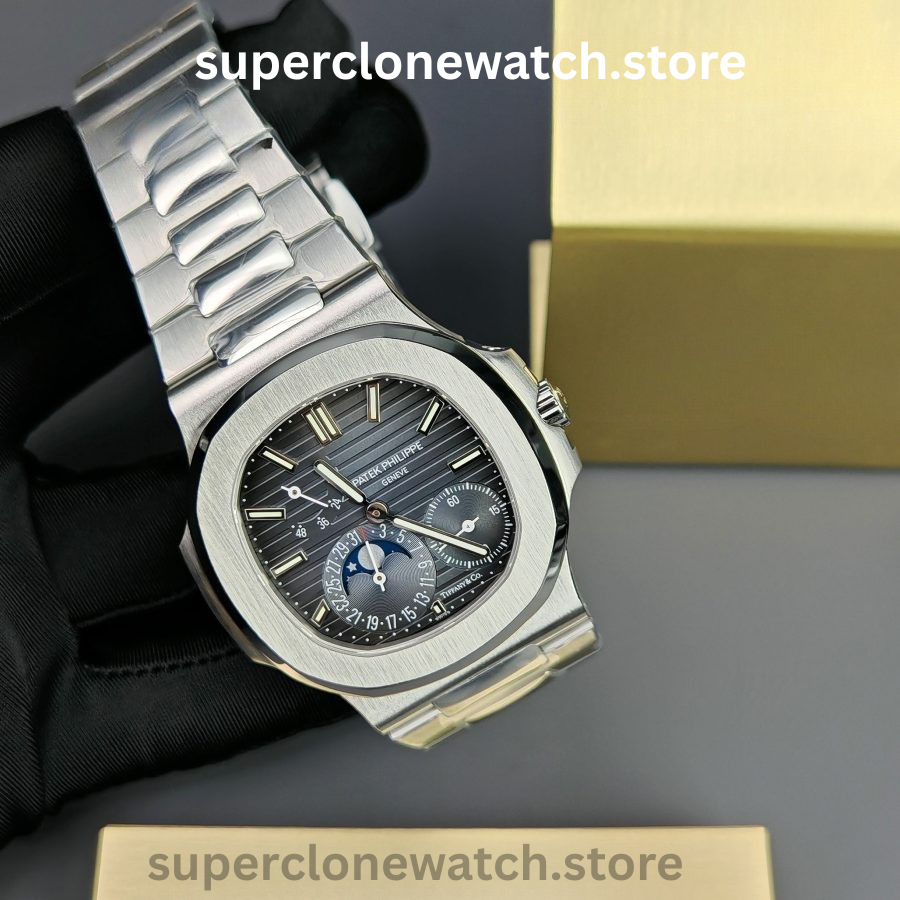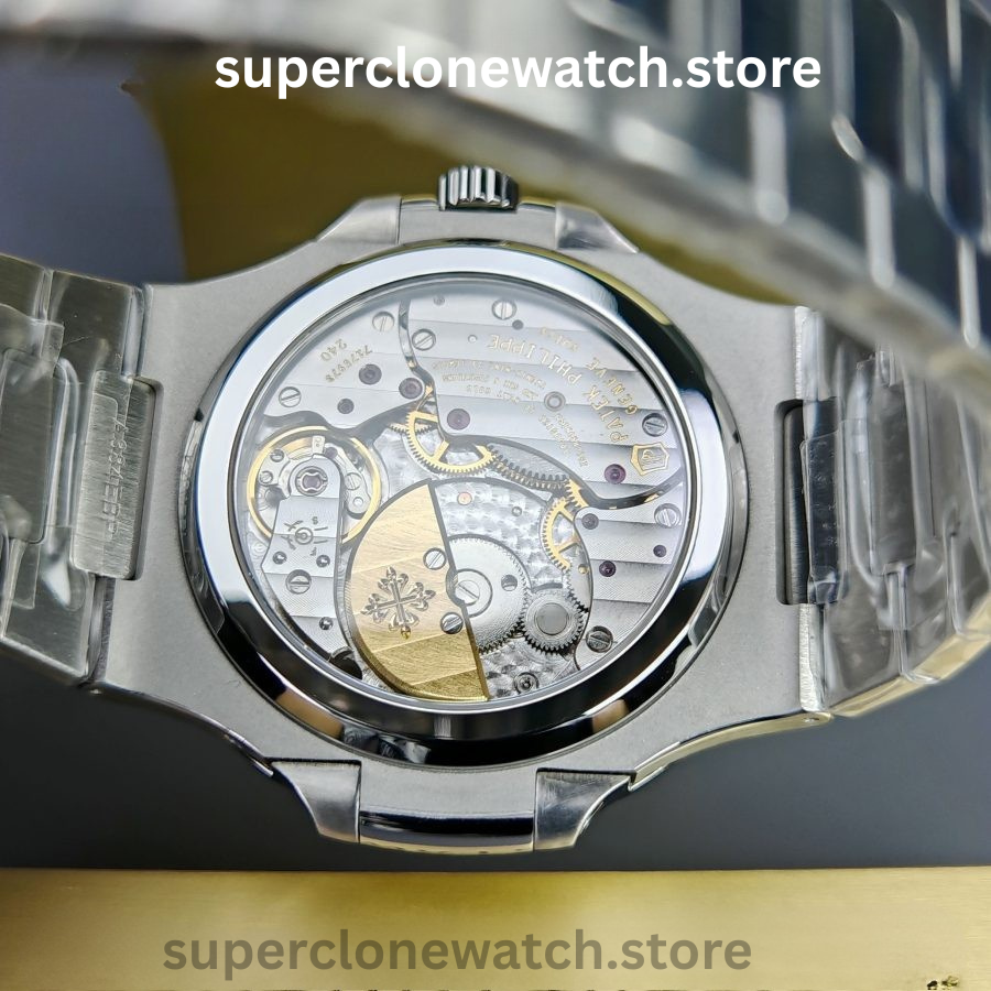 Powered by the Super Clone Calibre 240, this micro-rotor movement maintains the slim Nautilus profile while supporting full complication functionality. -