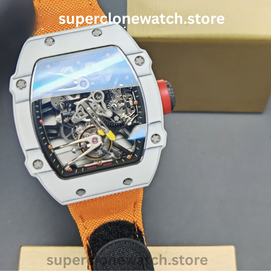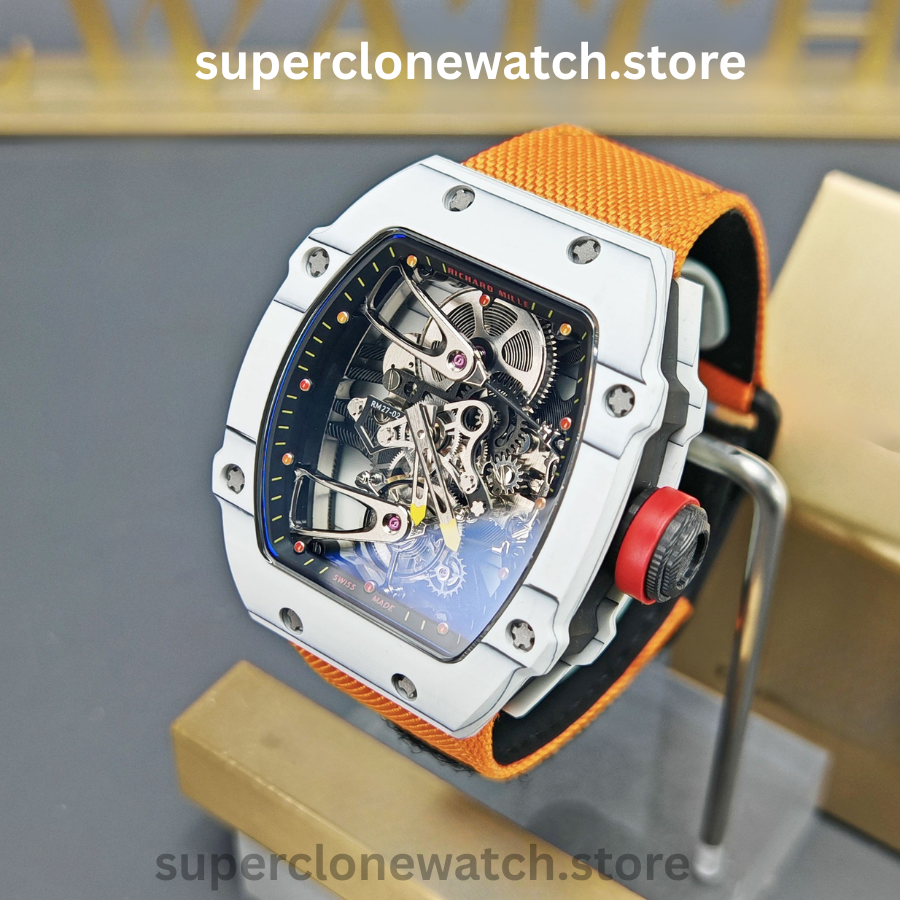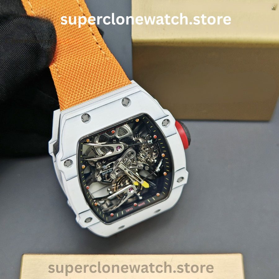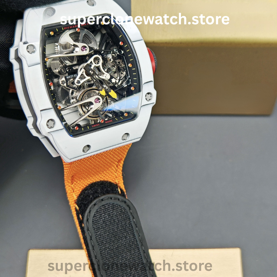 Discover extreme horology with the Richard Mille RM27-02 White QTPT Super Clone Watch, a true 1:1 recreation of one of the most iconic ultra-light sports tourbillon watches ever created. This model blends advanced materials, precision mechanics, and bold design—engineered for both performance and prestige.