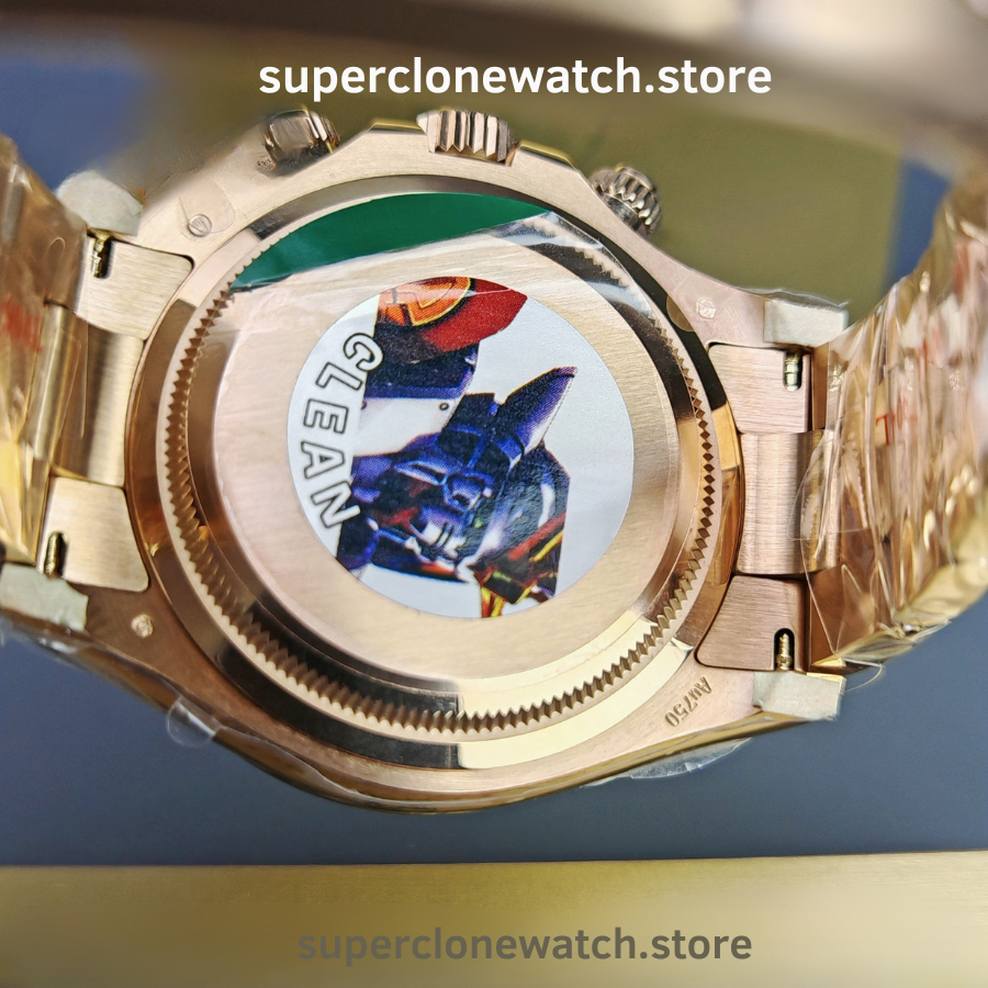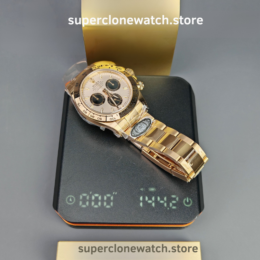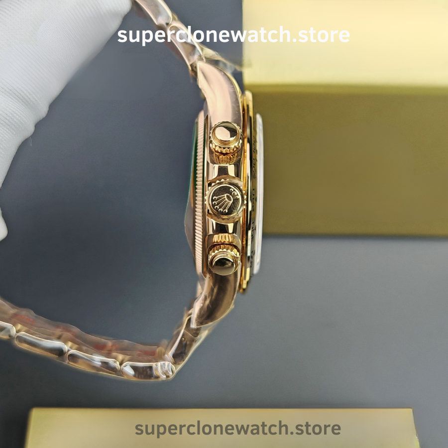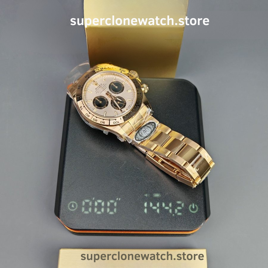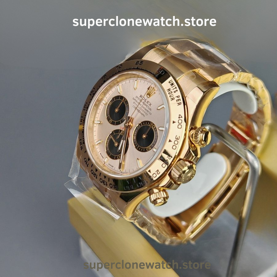 The Rolex Daytona M126505-0003 Super Clone is a high-accuracy chronograph replica crafted to match the original in size, materials, and functionality. Featuring a 40mm case, 18K rose gold plating, and a 1:1 clone of the Rolex Calibre 4131, this model delivers authentic performance and refined finishing for collectors seeking realism.
