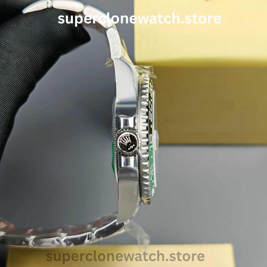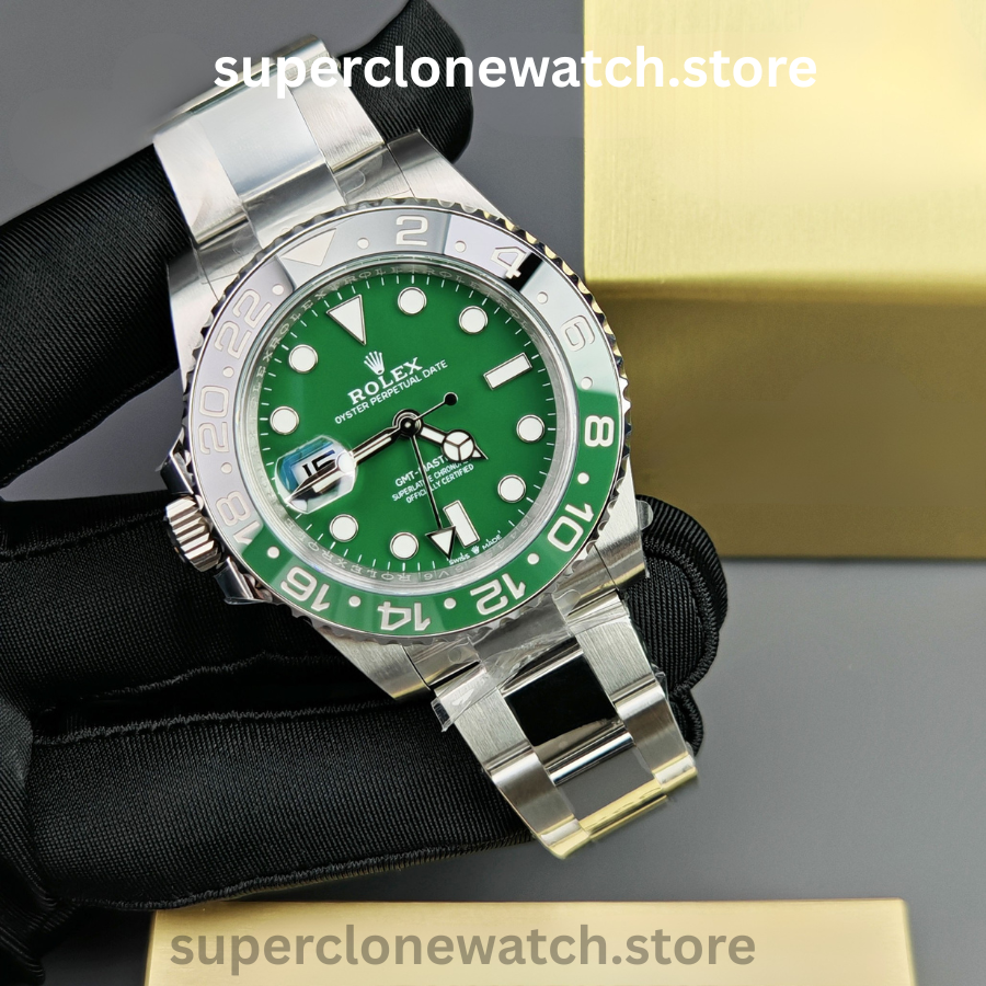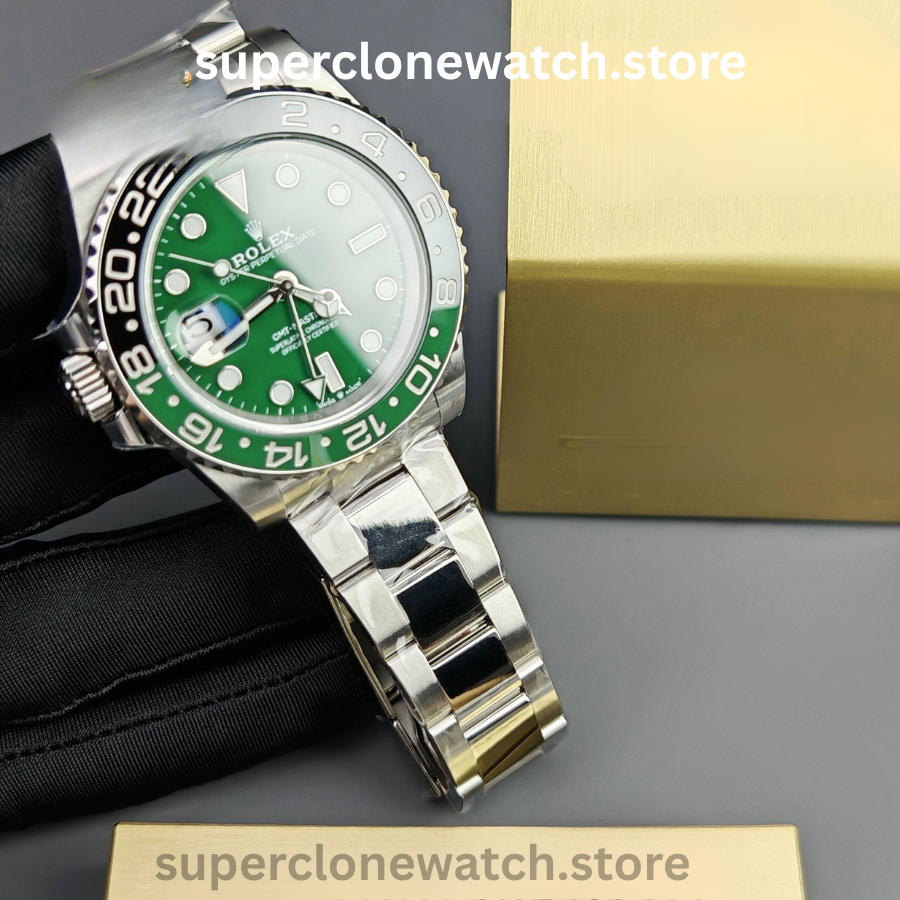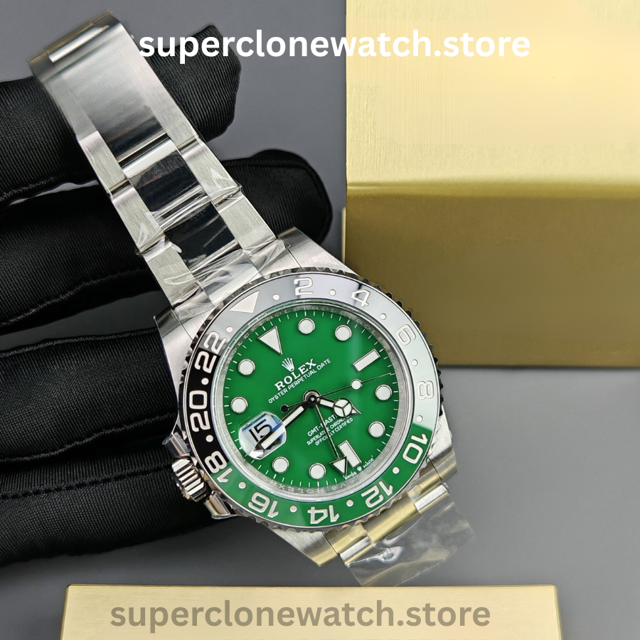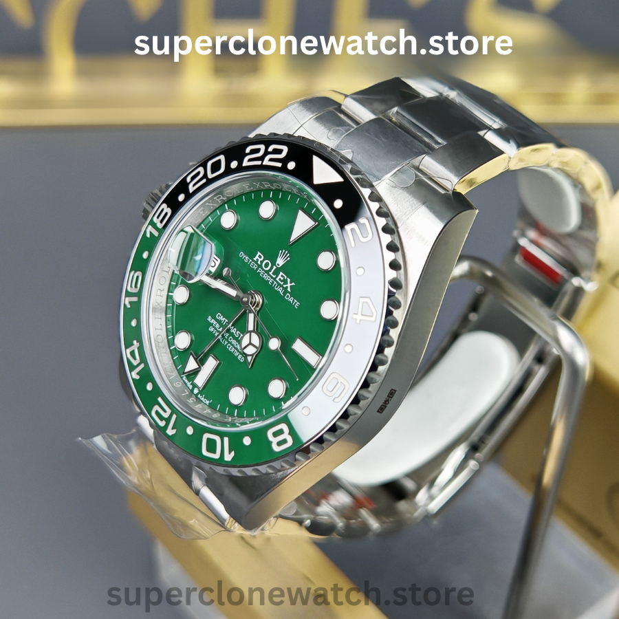 Powered by a clone Rolex 3285 automatic movement, this Super Clone GMT-Master II delivers smooth timekeeping, a fully functional GMT complication, and reliable performance. With a scratch-resistant sapphire crystal, Cyclops magnification, and solid Oyster bracelet, this timepiece is built for both daily wear and global travel.