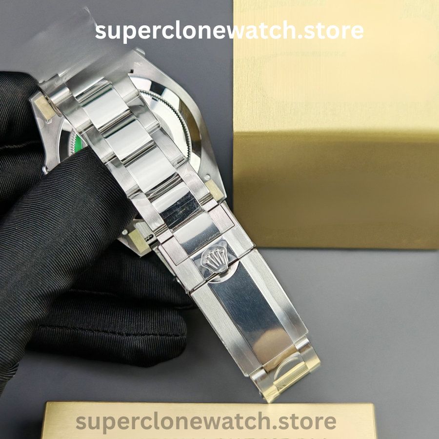 The watch features a perfectly proportioned 40mm case, crafted from pure 904L Oystersteel, offering exceptional corrosion resistance and a polished finish that closely matches the genuine Rolex. Its bidirectional 24-hour Cerachrom bezel is made from high-quality ceramic with embossed numerals and graduations, ensuring durability and an authentic luxury feel.