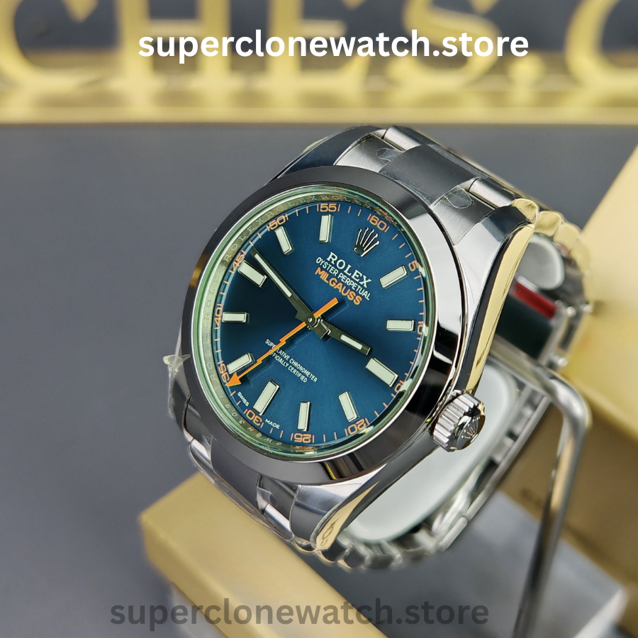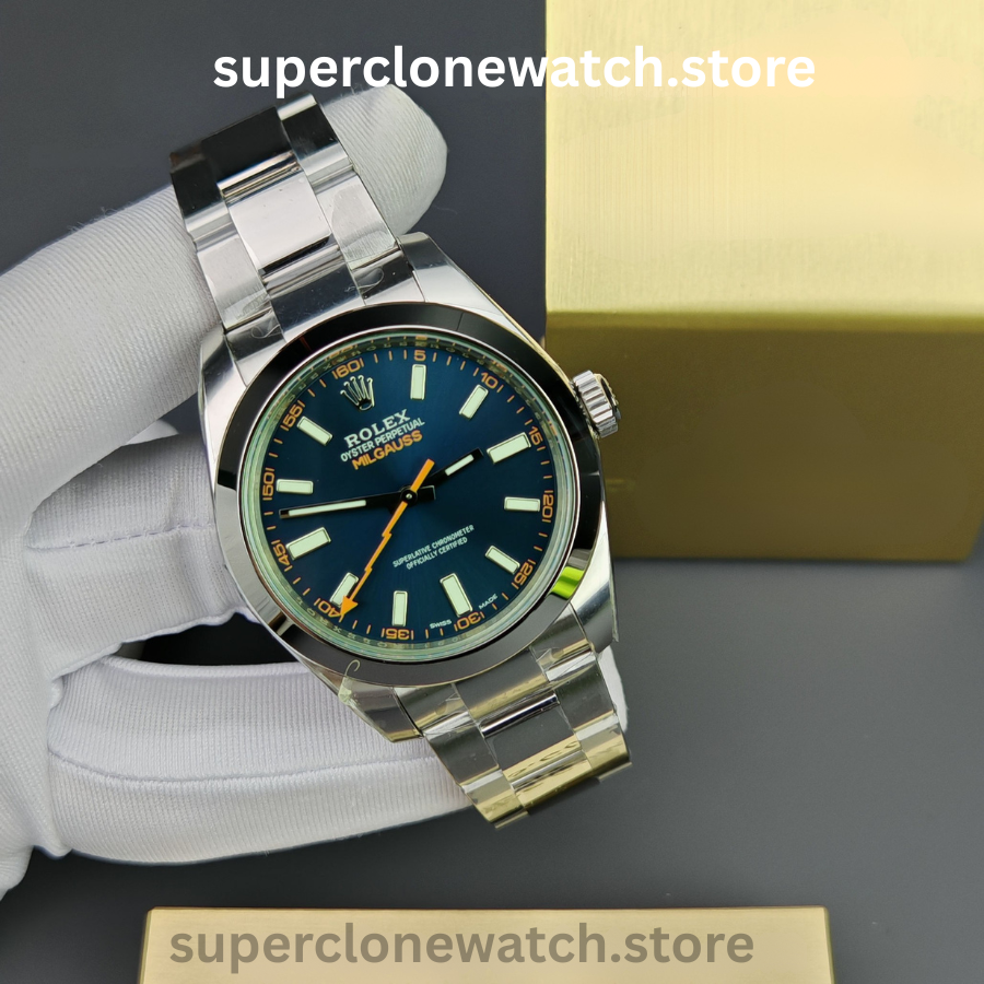 The Rolex Milgauss M116400GV-0002 Super Clone showcases a vibrant blue dial that delivers a sleek, timeless appearance with strong visual impact.